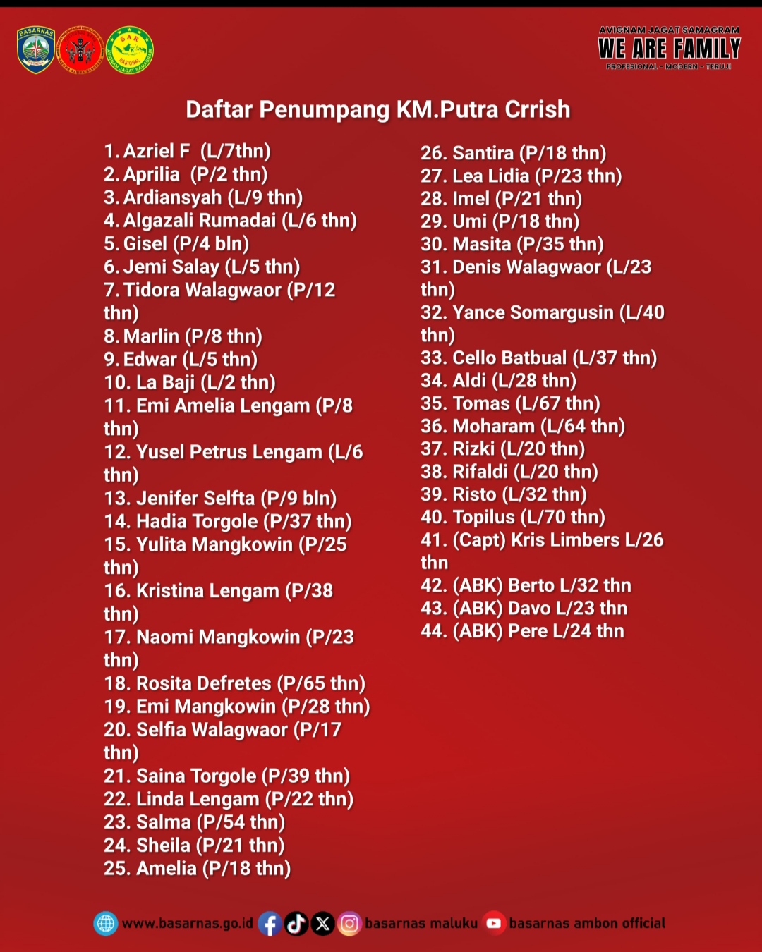 AMBON, MPNews.com – Sebanyak 44 Penumpang KM.Putra Crrish berhasil diselamatkan Tim SAR Gabungan, akibat  Kandas disekitar Perairan Benjina Kepulauan Aru, Rabu (15/4/2026).