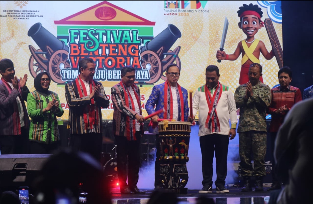 AMBON, MPNews.com – Gubernur Maluku, Hendrik Lewerissa, menyaksikan pembukaan Festival Banteng Victoria yang ditandai pemukulan tifa oleh Wakil Menteri Dalam Negeri, Bima Arya, Wakil Gubernur Abdullah Vanath dan Wali Kota Ambon, Bodewin Wattimena di Lapangan Merdeka, Jum’at, 17 Oktober 2025.