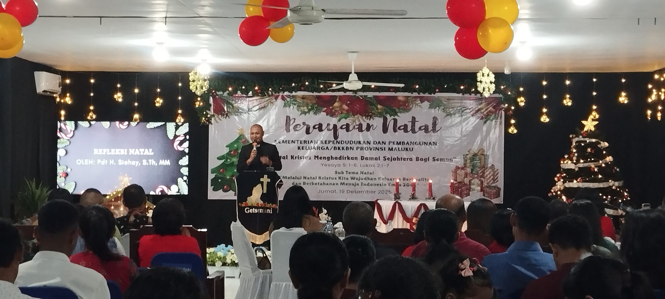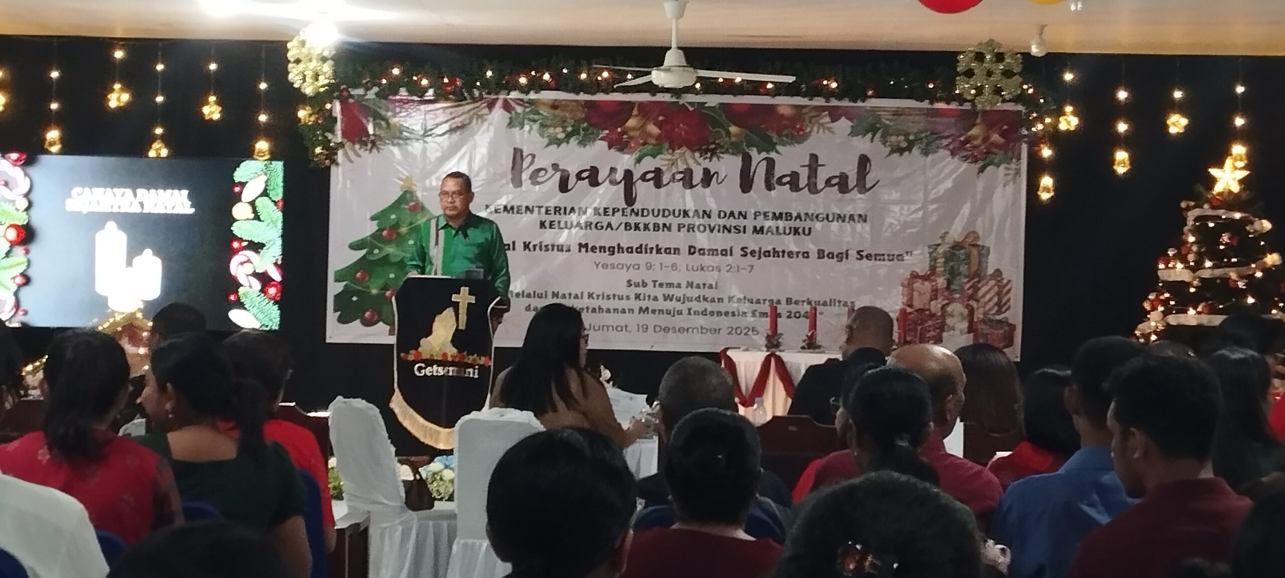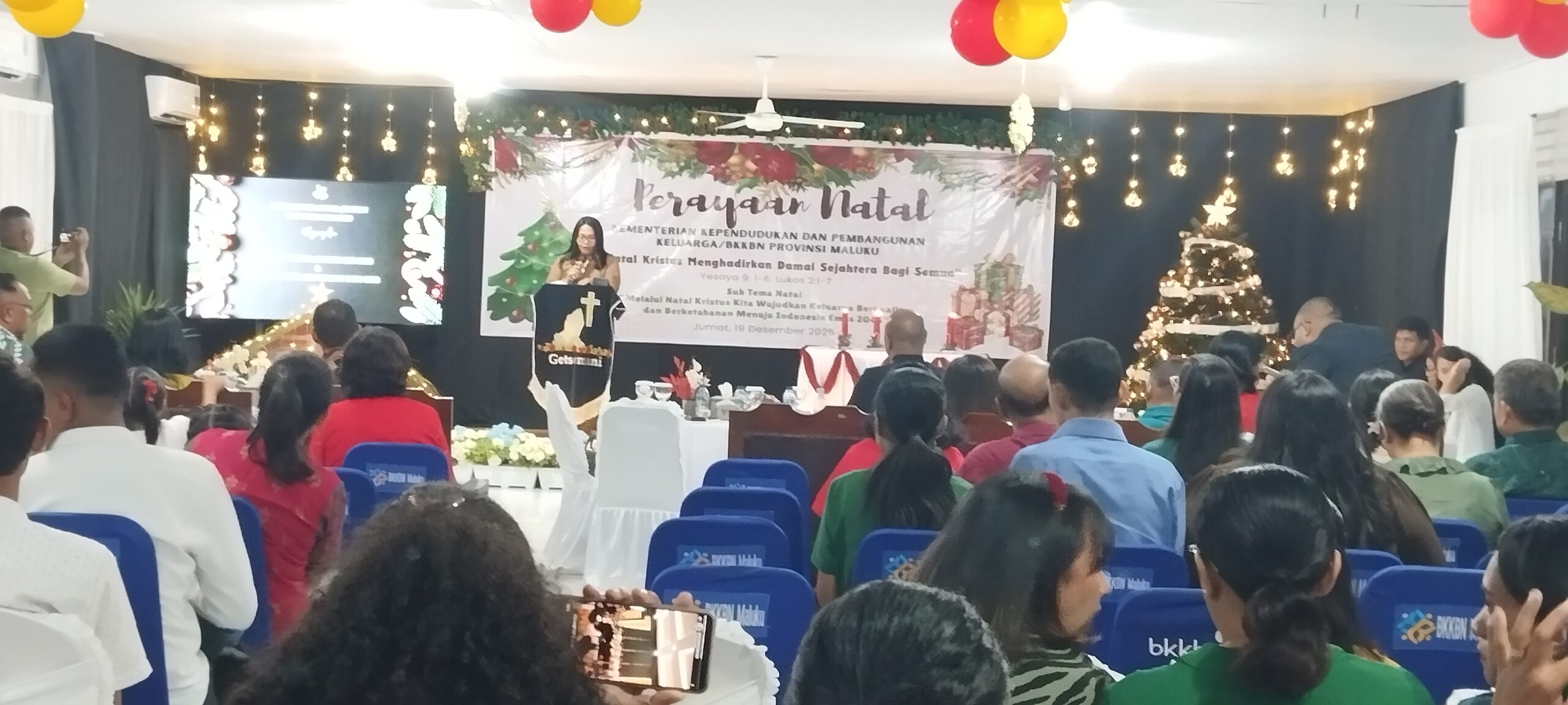 Perayaan Natal yang turut dihadiri oleh Kepala Perwakilan BKKBN/Kemendukbangga/BKKBN Provinsi Maluku dan seluruh staf juga dilaksanakan dibawah sorotan tema :Natal Kristus Menghadirkan Damai Sejahteran Bagi Sesama Yesaya 9:1-6 dan Lukas 2:1-7 dan sub tema : Melalui Natal Kristus Kita Menghadirkan Keluarga Berkualitas dan Berketahanan Menuju Indonesia Emas 2045.