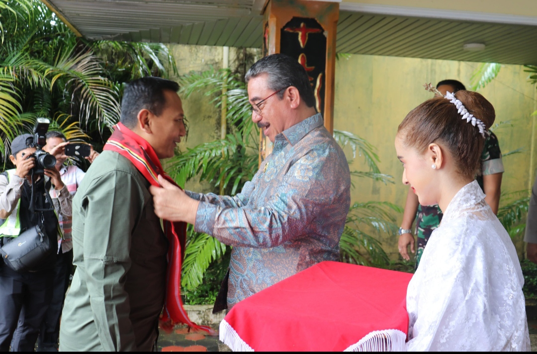 Ambon, MPNews.com – Gubernur Maluku Hendrik Lewerissa beserta Forkopimda menyambut kedatangan Wakil Menteri (Wamen) Kehutanan RI, Rohmat Marzuki,S.Hut yang tiba dengan menggunakan pesawat Wings Air IW 1181 pukul 12.44 WIT, dan prosesi penyambutan dilakukan dengan pengalungan kain tenun khas Maluku serta diiringi musik tifa totobuang bertempat di VIP Room Bandara Pattimura Ambon, Rabu (24/9/2025).