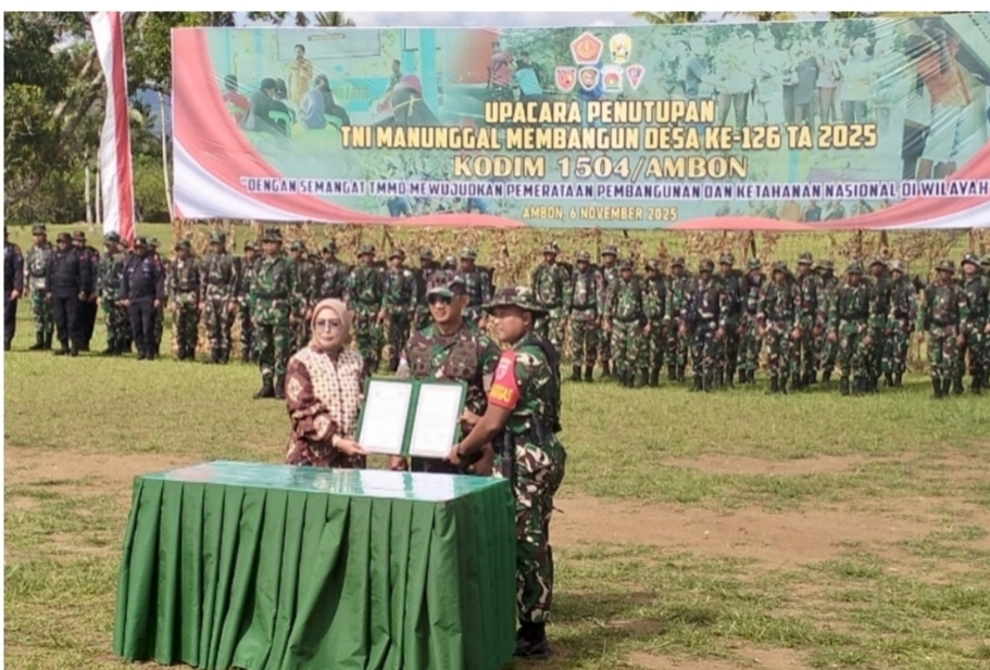 Penutupan TMMD ke-126 secara resmi dipimpin oleh Pangdam XV/Pattimura, Mayjen TNI Putranto Gatot Sri Handoyo di lapangan bola Dusun Telaga Kodok, Kecamatan Leihitu, Kabupaten Maluku Tengah, Kamis (6/11/2025). Momen tersebut menjadi simbol kuat kolaborasi antara TNI dan pemerintah daerah.